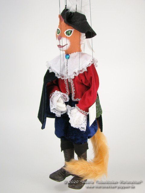 Gato con botas la Marioneta Titere decorativa checa es controlada por medio de hilos, varillas y un balancín especial en forma de cruz (báscula) . La cabeza, manos son vaciadas de yeso modificado para escultura, el cuerpo y piernas es hecho de madera de tilo. Para la confección de la vestimenta se utilizan varios tipos de textil, materiales naturales, lino, algodón, cuero. La marioneta está pintada con pinturas no tóxicas y resistentes al agua. Esta marioneta puede ser utilizada en calidad de juguete de desarrollo para niños a partir de los 5 años o como un singular recuerdo checo, un regalo original objetos decorativos para interiores