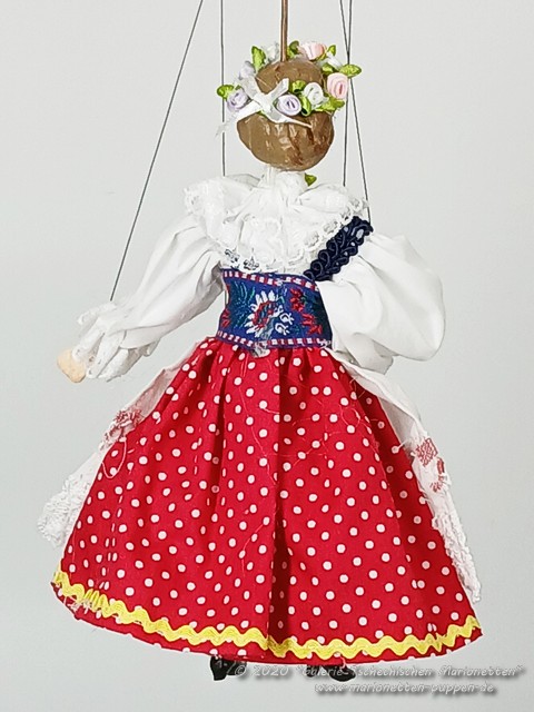 La cabeza y las extremidades del títere están hechas de modificaciones de yeso. Otras piezas son de madera y las piezas de conexión están hechas de alambre. La marioneta está pintada a mano con tintes inofensivos resistentes al agua. Las marionetas están destinadas a coleccionistas y al teatro de marionetas, o como ayuda educativa original o como herramienta de juego. La títere traje folklórico confeccionado a mano, pueden producirse ligeras variaciones en el tejido y el color.